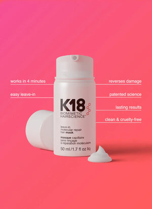 K18 Leave-In Molecular Repair Hair Mask 50ml is a 4-minute treatment that repairs hair chains at the molecular level, reversing hair damage caused by chemical treatments, bleaching, coloring, or heat.